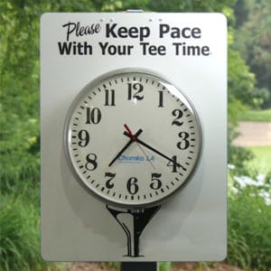 As players arrive at the third hole, they will see the clock. If they’re tee time is displayed on the clock, they have confirmation that their pace is suitable for the course. If they’re tee time has already passed on the clock, they will know that they are falling behind and hasten the proceedings. No confrontations are required.
